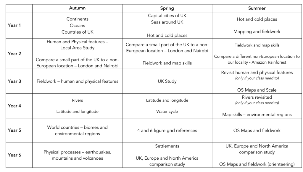 The Geography curriculum is planned so that the retention of knowledge is much more than just ‘in the moment knowledge’. The cumulative nature of the curriculum is made memorable by mindful implementation and preparing to teach. This is including retrieval and spaced retrieval practice, word building and deliberate practice tasks. The effect of this cumulative model supports opportunities for children to associate and connect with places, spaces, scale, people, culture and processes.